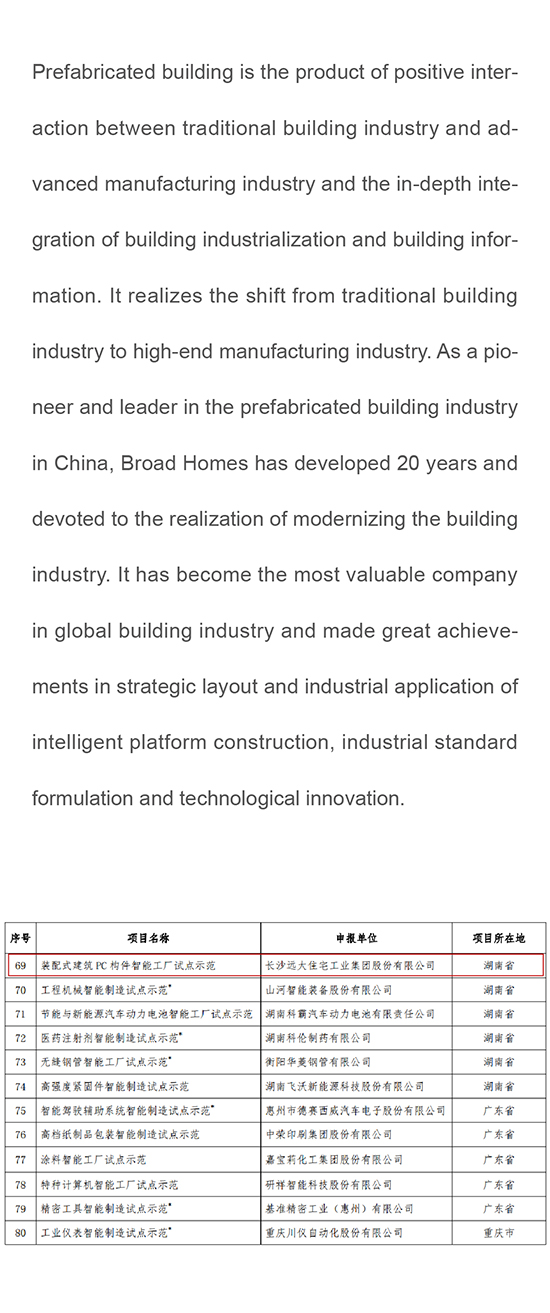 First “State-Initiated” Intelligent Manufacturing Project in Building Industrialization Sector is Published Broad Homes’ Project Listed as 2018 Intelligent Manufacturing Pilot Project of MIIT