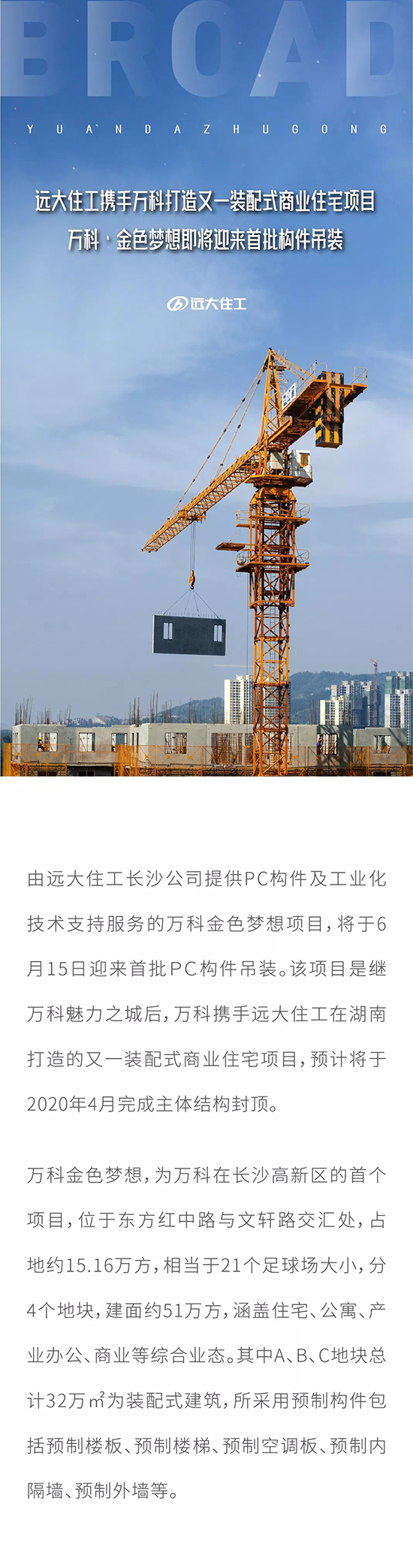 遠大住工攜手萬科打造又一裝配式商業住宅項目 萬科·金色夢想即將迎來首批構件吊裝